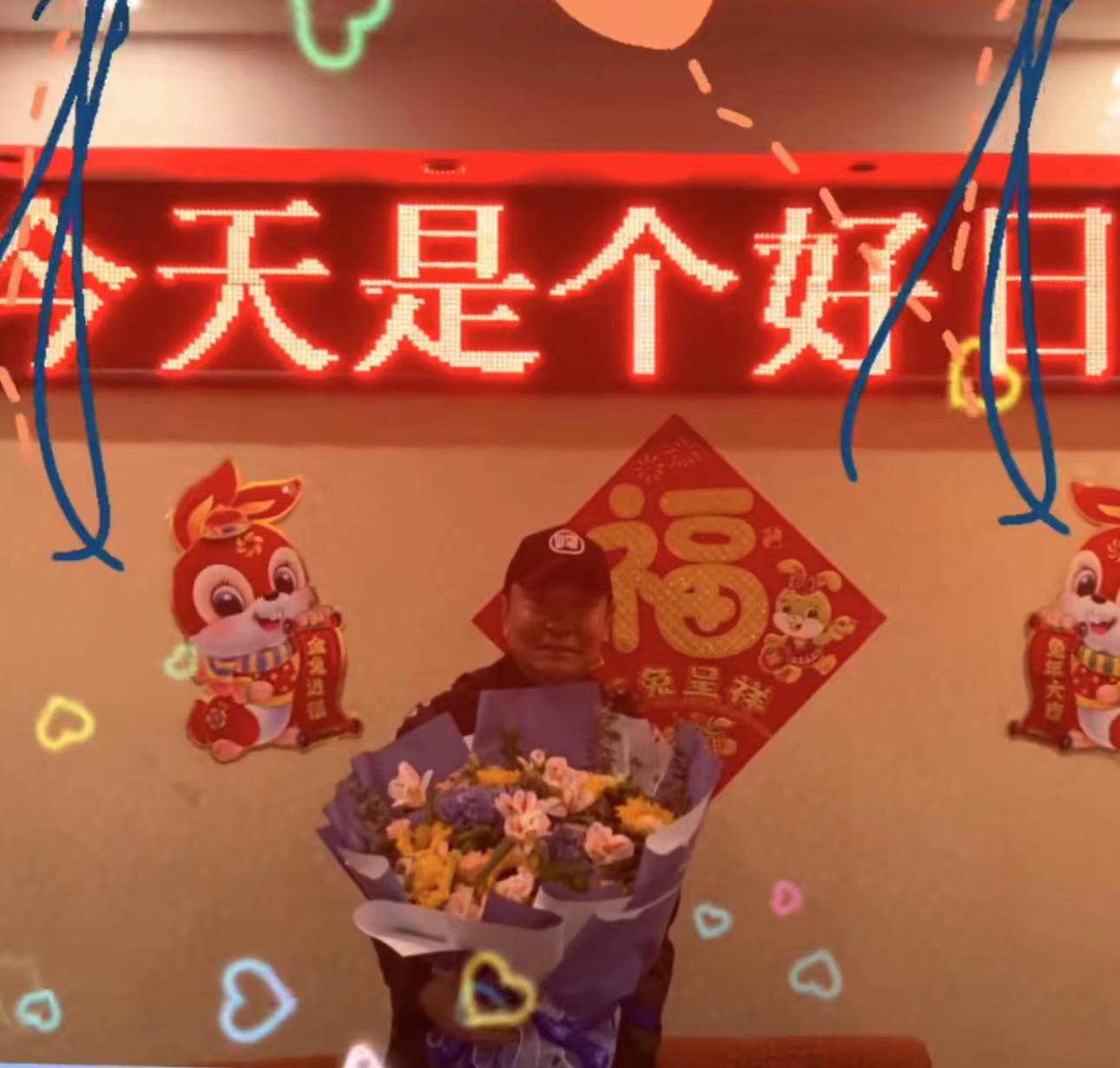 照片中,高峰穿着几十元的运动T恤,戴着棒球帽,打扮低调。只见他抱着一大束鲜花,笑眯眯地在某高档餐厅拍照。