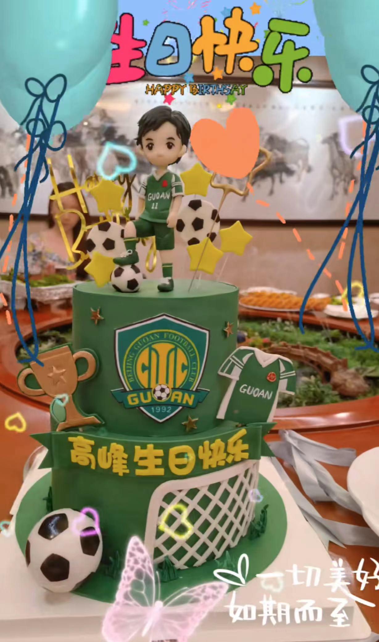 原来,为了庆祝生日,高峰在一家装修豪华的餐厅里宴请亲朋好友,现场还准备了一个绿色的足球主题蛋糕,看起来特别精致。