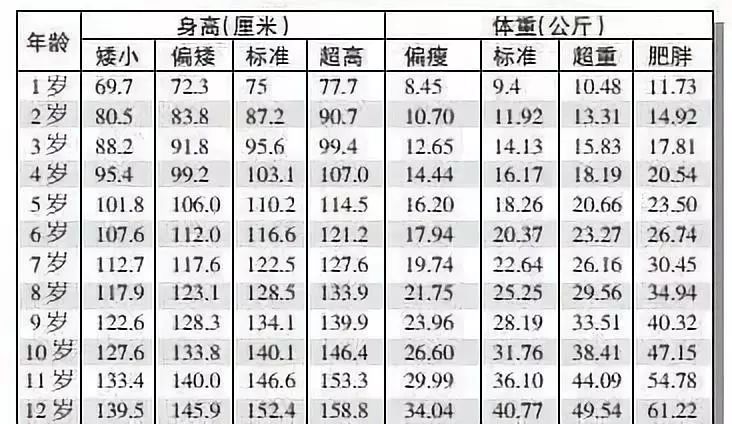 1-12岁身高体重对照表 1-12岁体重对照表