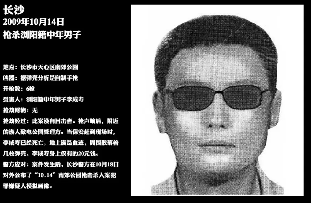 2009年10月14日,枪案再现,在长沙市天心区南郊公园散步的李成寿身中6枪遇害,令人奇怪的是他身上的20元钱却未被抢走,这是众多受害人中唯一一次未被抢钱的,可能是嫌犯觉得受害人身上钱太少,于是开了数枪泄愤。