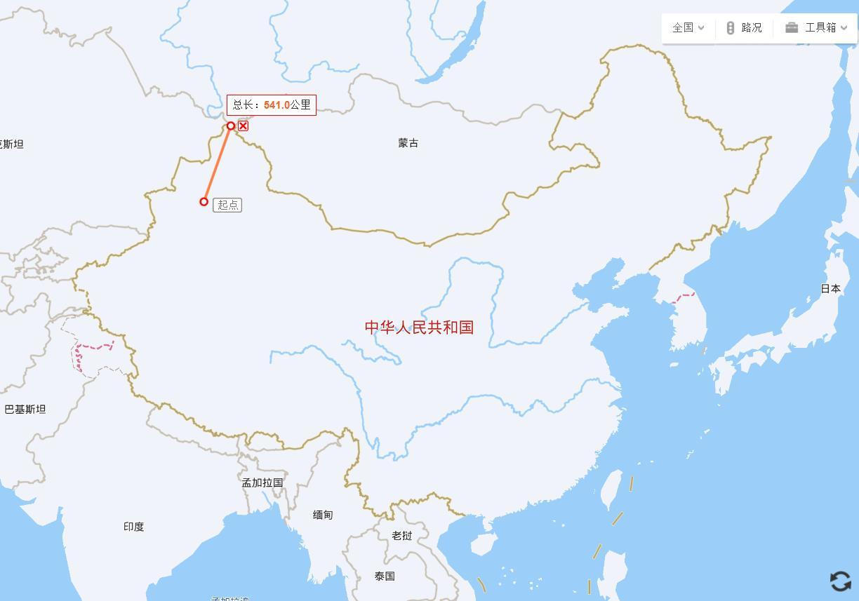 假设此时三级火箭的飞行高度为200千米的高度,那么在奎屯市以20度左右看到的范围大约是550千米,笔者测量了下从奎屯市到边境最远还真的在540千米左右,所以说目前拜科努尔发射载人飞船很有可能还是以51.6度的倾角发射的。