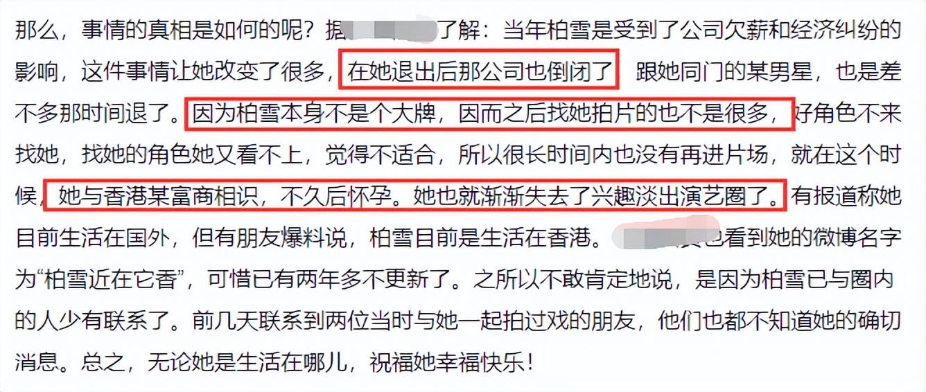 柏雪灵异事件沸沸扬扬地传了10年,比较靠谱的说法是她与经纪公司合作得不愉快,后来接不到戏,又恰好结识富商,便结婚生子了。