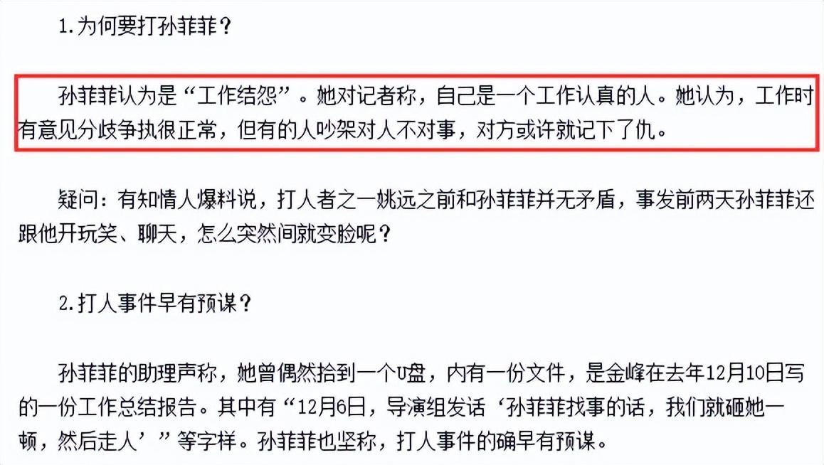 孙菲菲称她也不知道自己为什么被打,也许是在工作上和剧组人员有分歧。