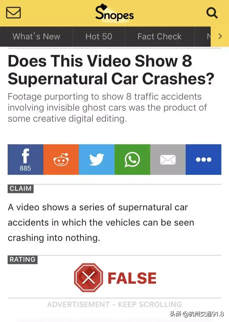 记者再以“Ghost Crash”为关键词进行查证,又有发现。美国的事实核查网站“SNOPES”已对“Ghost Crash”这段视频进行了辟谣。