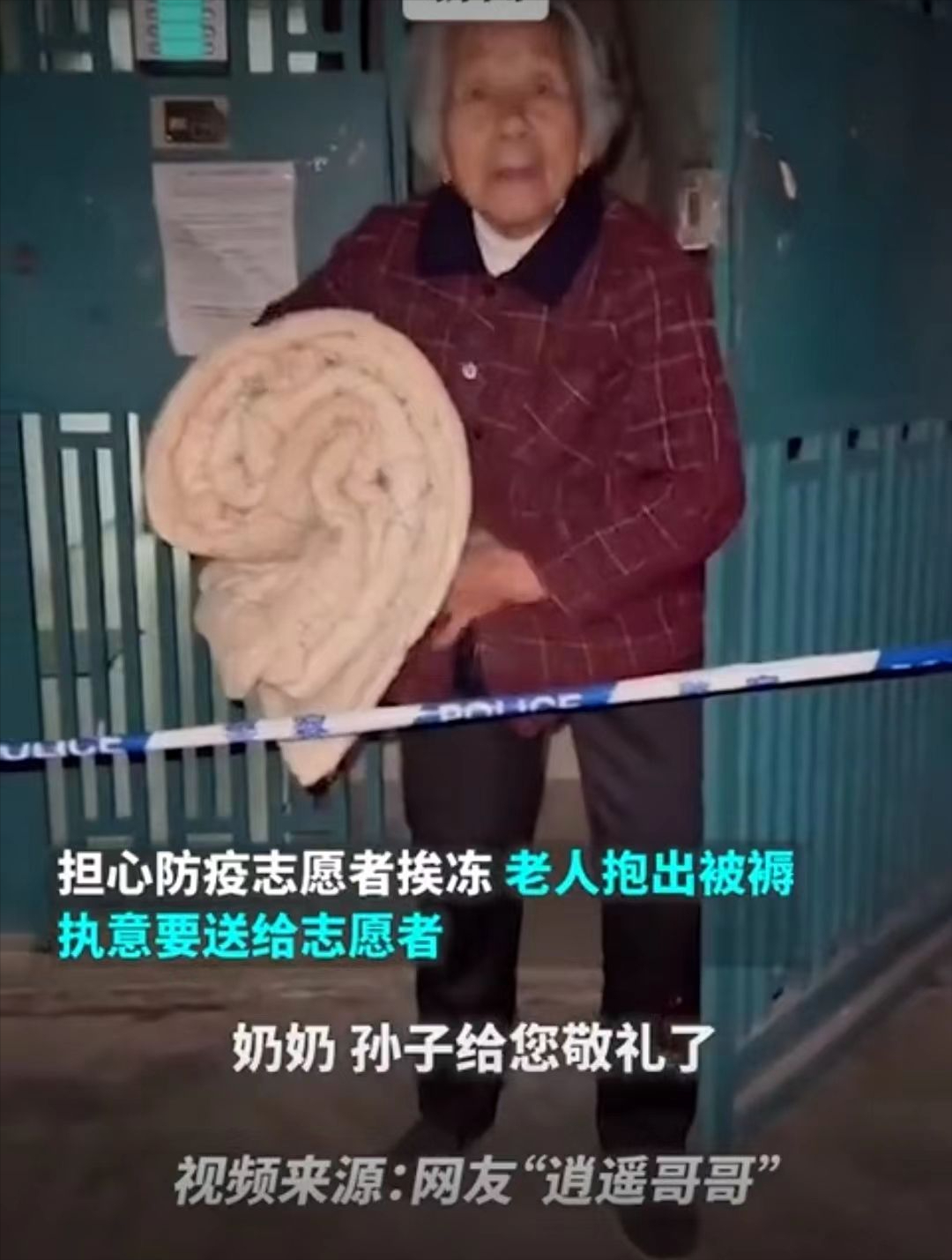 有一位老人家,担心防疫的志愿者晚上冷,抱出被褥,让他们一定收下。